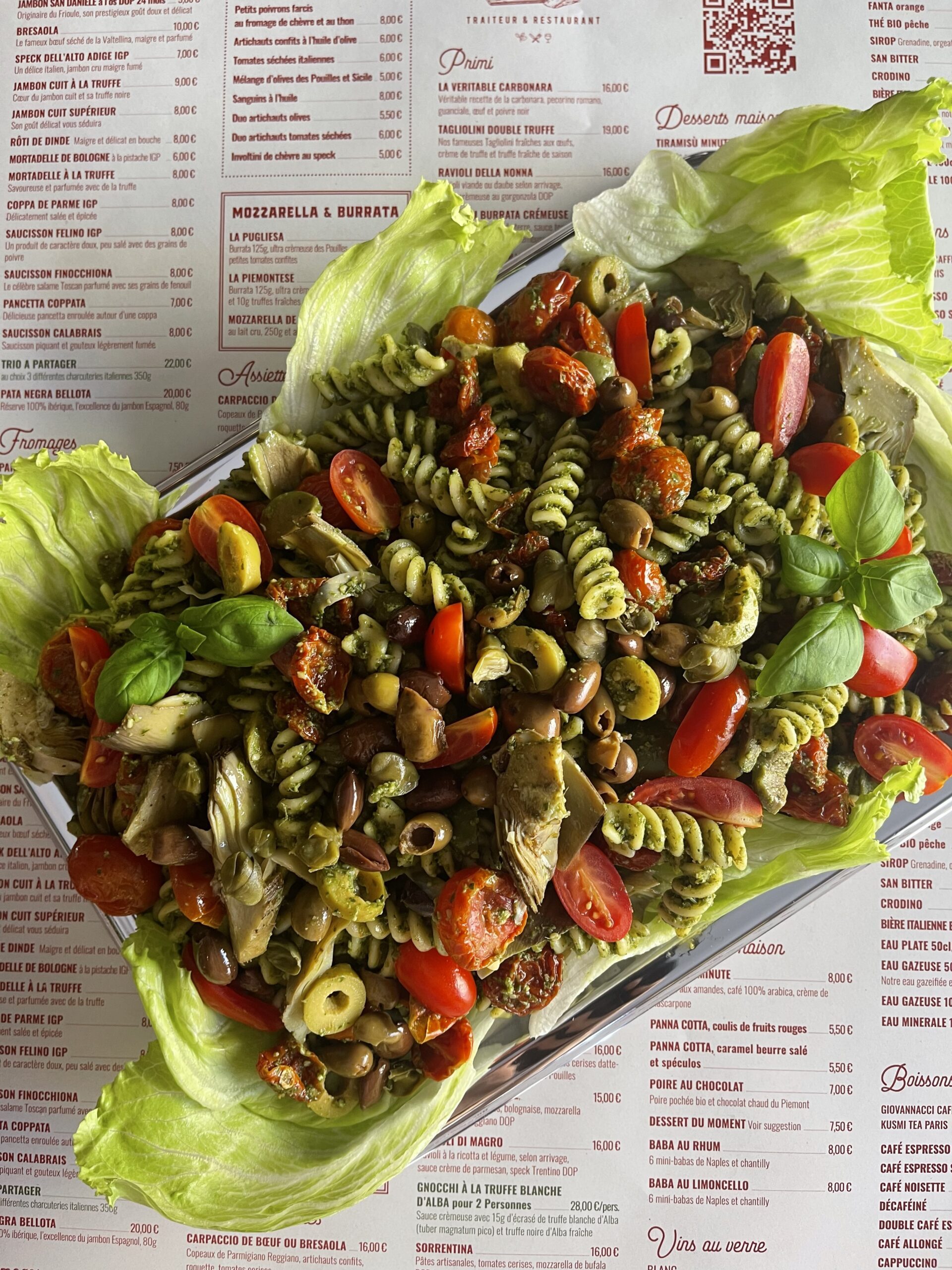 Pâtes artisanales, tomates cerises italienne et confites, artichauts confits, câpres, olives taggiasche, pesto
